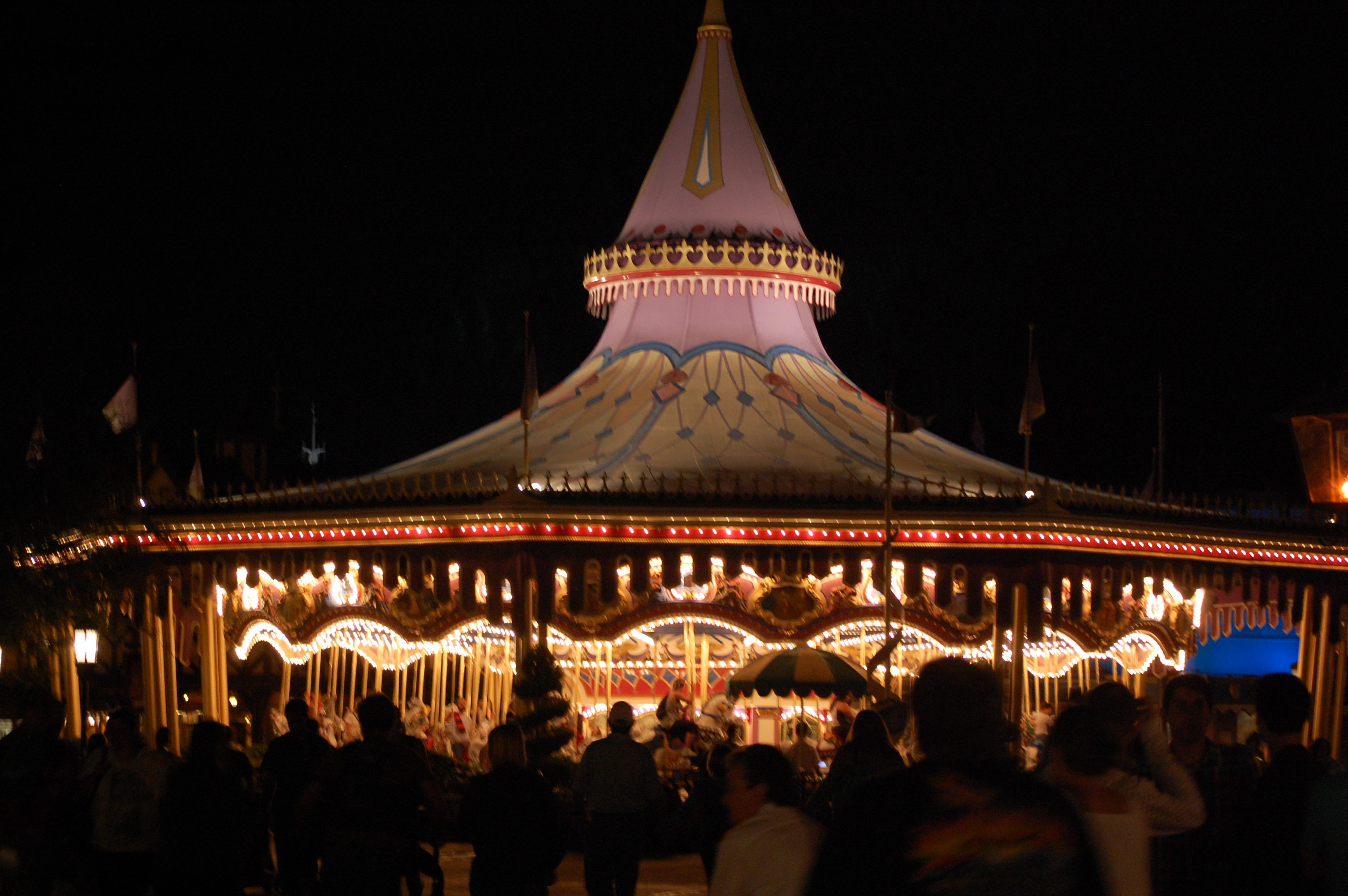 While waiting we spy a bus to the Contemporary, so we jump on that instead, and then make the quick walk from there to the Magic Kingdom. Once inside, we search high and low for a Mickey head ice cream bar -CP’s favorite WDW treat – which we just can’t find. We check Main Street, Adventureland, and nothing. Defeated, we enjoy our own row on Pirates of the Caribbean, which at this time of night was an easy walk-on. Afterward we finally find a Mickey bar in Frontierland, so CP eats that while I munch on some popcorn as we sit in Liberty Square and watch the people passing by. After one final ride on the Haunted Mansion, we depart through Fantasyland toward Tomorrowland, hoping for a short Space Mountain line. The line is abysmal – if I remember correctly the ride might have been shut down – so we give up, walk down a crazy Main Street and into the Emporium, where we buy a few last minute souvenirs, including the cuddliest Pluto you’ll ever find.