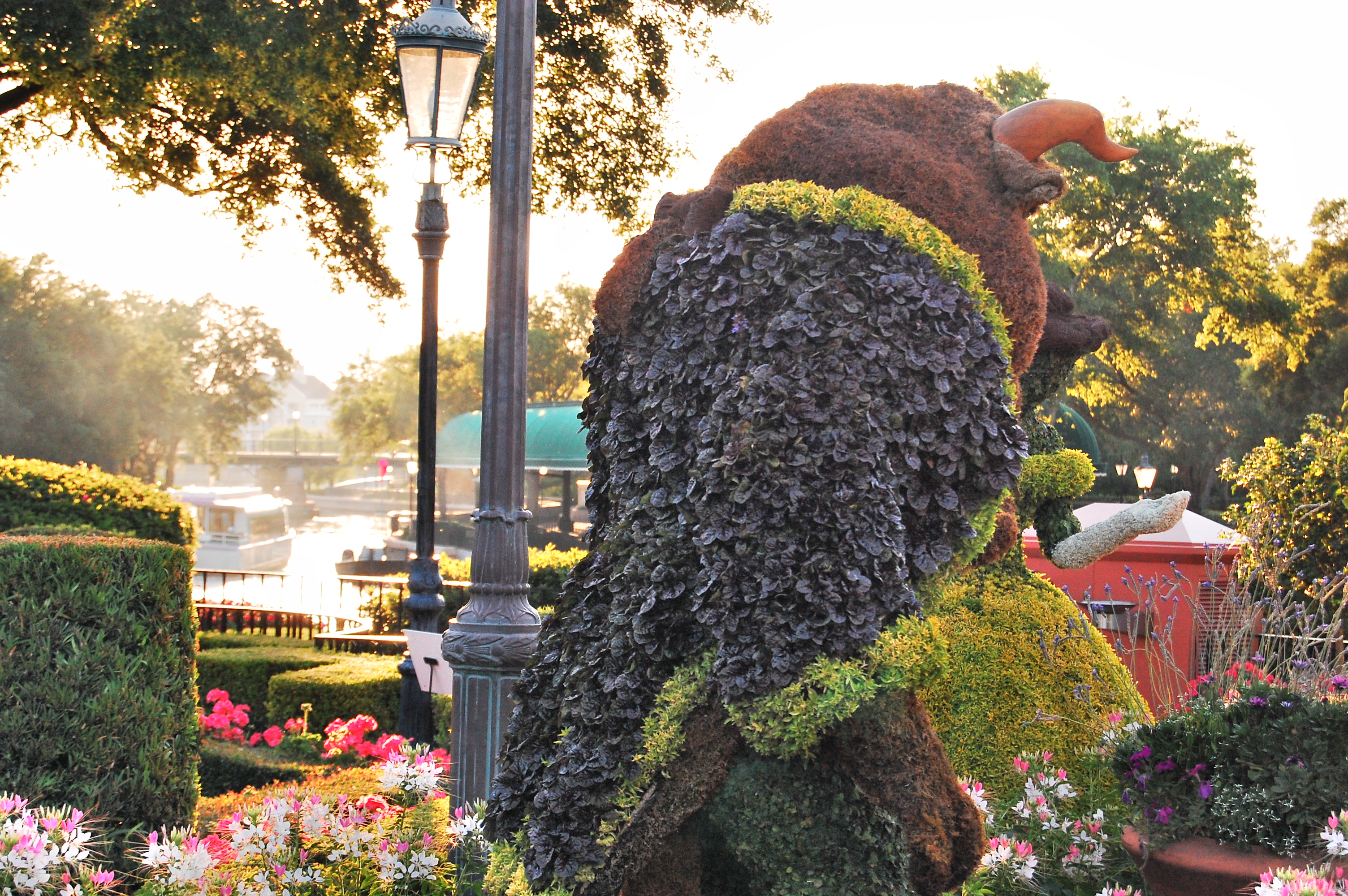 Shopping completed, we headed back to the BoardWalk to relax with a beer on our balcony before heading back to Epcot around 7pm. We leisurely strolled, taking pictures of the topiaries and beautiful gardens in France, and then decided to browse the stores there before taking in the Impressions de France movie. The moving showing turned out to be delayed, as it was announced that a gentleman in an earlier showing had lost his wedding ring, and staff were currently scouring the theatre in hopes of finding it for him. (We never did learn how it turned out.) A French Cast Member entertained the growing crowds with a French song singalong and France trivia, and soon enough we were seated and taking in the lovely film.