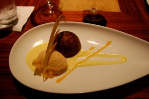 For our entrees, CP ordered the Peri Peri chicken, a fantastically spiced dish named for a former college program cast member at AKL who shared the dish’s recipe with the staff. As for me, I splurged and ordered the $41 (!) oak-grilled filet, which was served with tender roasted potatoes and fresh grilled asparagus and which was worth every single penny.Full but undaunted, we continued with dessert, CP ordering something chocolate (which wasn’t on the menu then, nor is it now – it was perhaps a pastry chef’s experiment?) and me ordering the Cape Malva pudding, a terrific bread pudding served with two fruit sorbets and a lovely vanilla custard. My dessert was accompanied by a terrific South African dessert wine, and CP ordered a pot of the most delicious chai tea either of us have ever tasted.