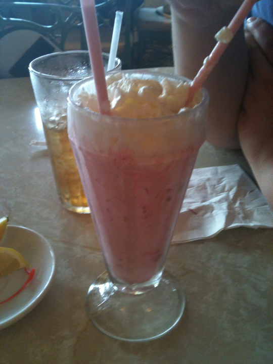 Our server is Ileana, and she is lovely and friendly without being overbearing; although the Plaza sees its fair share of visits from the Mayor and other “streetmosphere” characters, they seem to have a good sense of which tables are into that sort of thing (not us), and who wants to just enjoy a meal and observe the action. CP orders a Diet Coke and I order a strawberry milkshake (hey, it’s vacation!), and we split a vegetarian sandwich and a Plaza club. We certainly enjoyed our meal, but we were seated in the main room this time (unlike our last visit, where we had a table in the solarium) near several tables of loud diners. We didn’t linger, thanked Ileana, and were on our way.
