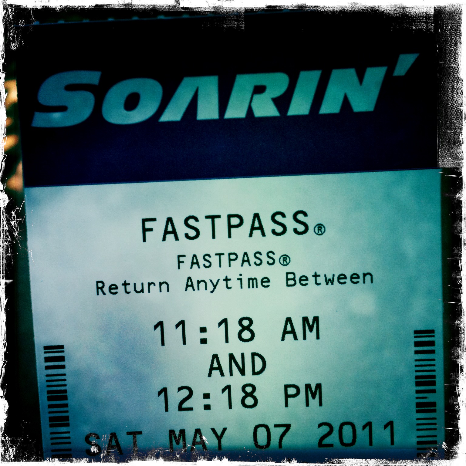 If you ride Soarin’ often, however, you know this isn’t really a bad wait compared to what it can be, even when you utilize a Fast Pass. Soon enough we were boarding, and were lucky enough to be assigned to the center glider, top row without having to ask. (Granted, I would have asked, but I’ve seen Cast Members roll their eyes at the request often enough to feel a little guilty about it.) Our prime seat location offered a terrific ride, and soon we were off and gathering Fast Passes for our next ride, scheduled between 11:18-12:18p.m.