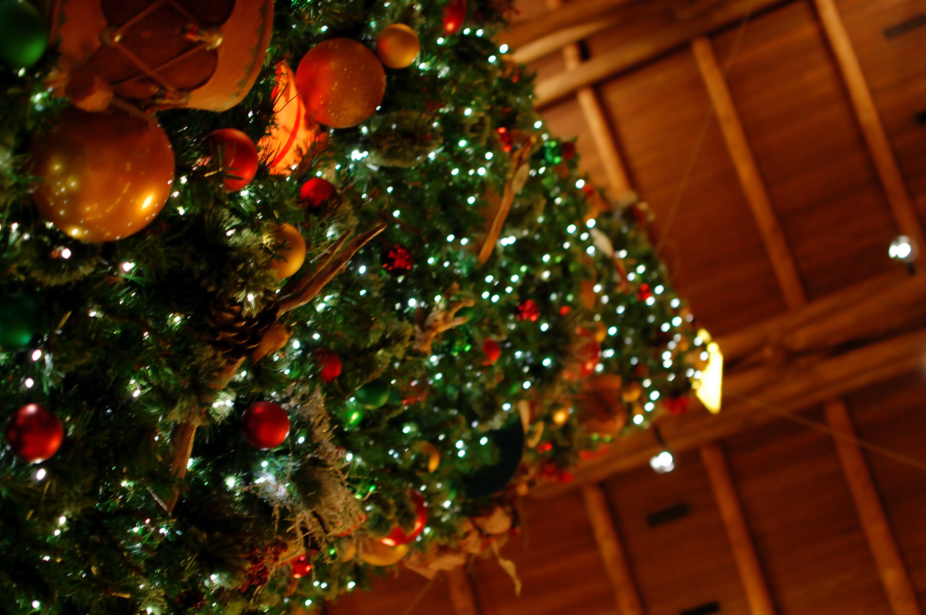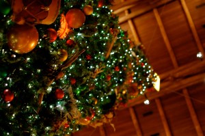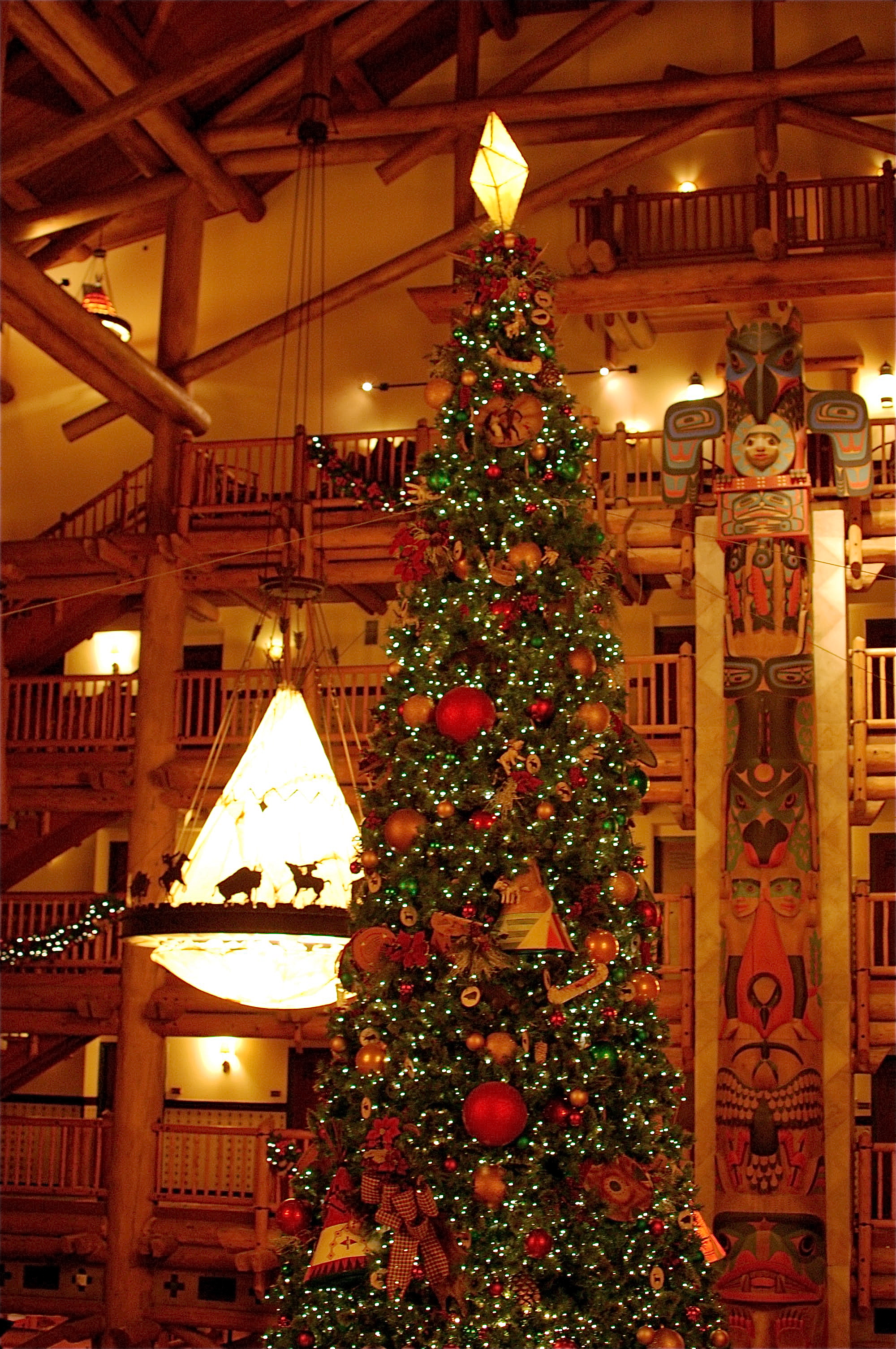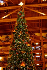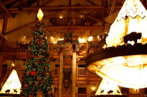 After lugging all of our stuff up the stairs (no elevators at OKW), we checked out the villa, unpacked, and showered in anticipation of our Artist Point dinner. The four of us piled into the Malibu around 5:15 and headed to the Wilderness Lodge to explore and take pictures before dinner. Of all the deluxe resorts, the Wilderness Lodge was the one I most wanted to see decorated for Christmas. It didn’t disappoint: