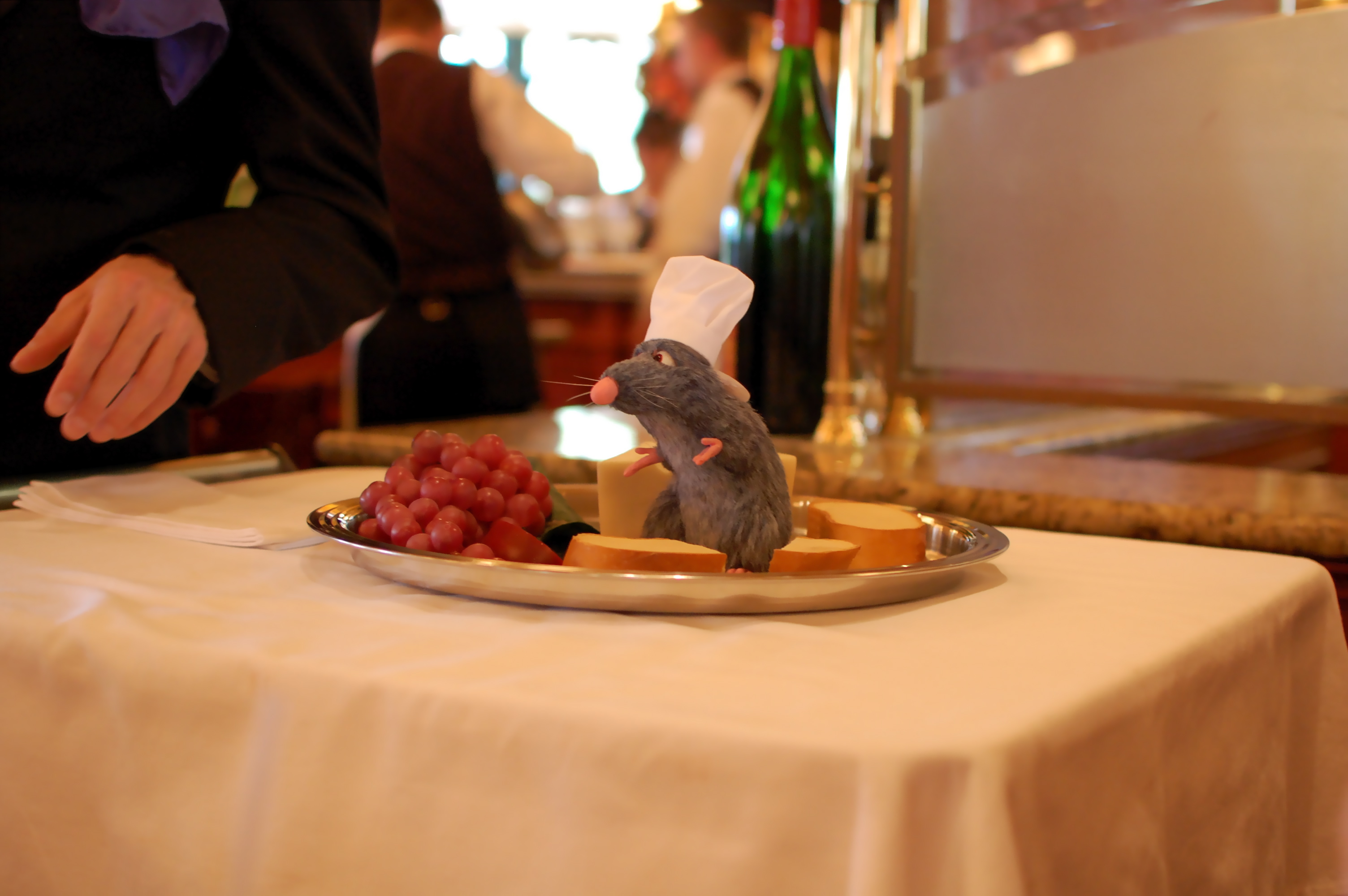 The best part of lunch, of course, was when a lovely “French” gentleman named “Armand” (I think he’s neither French nor named “Armand”) wheeled a cart to our table, upon which sat a sterling silver cloche. He lifted the lid of the cloche and revealed…Remy! I had completely forgotten about this and was delighted. In fact, all of us were delighted – Armand was charming (especially to my grandmother, mais oui), Remy adorable.