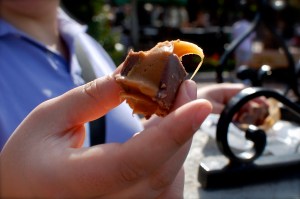 Now starving, we headed back to Morocco to dine at Tangierene Cafe, our favorite quick service location in all of WDW. Now recovering vegetarians, we decided it was time to sample something besides the vegetarian platter, so we ordered that and a chicken shwarma platter. Yeah, bad idea – the chicken was gross and stringy, so for the foreseeable future we’ll stick with the veggie platter.  Restored, we returned to Germany for some dessert, since I had decided it was finally time to sample the wares from the