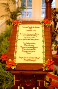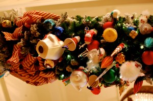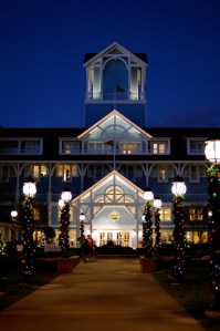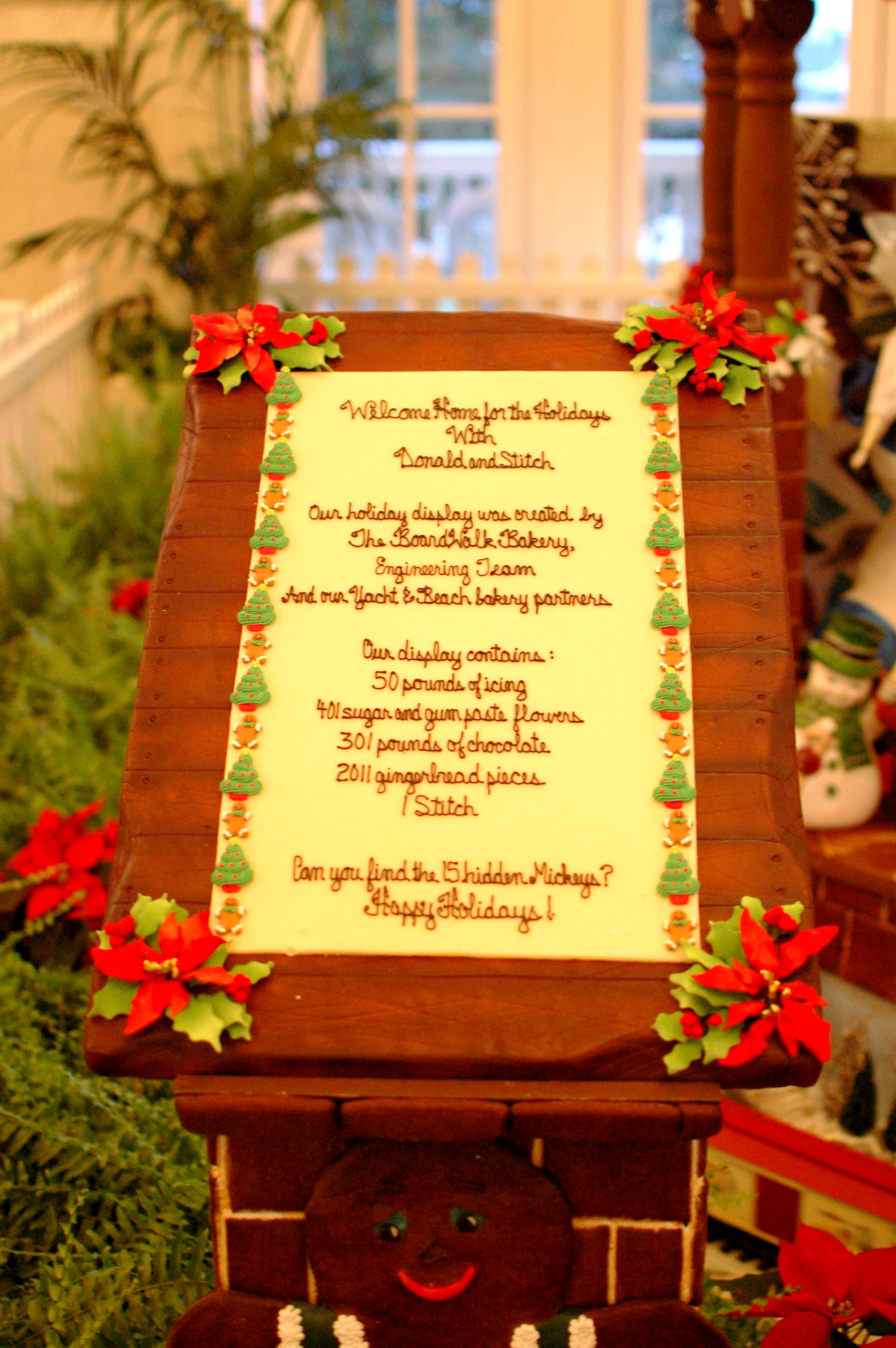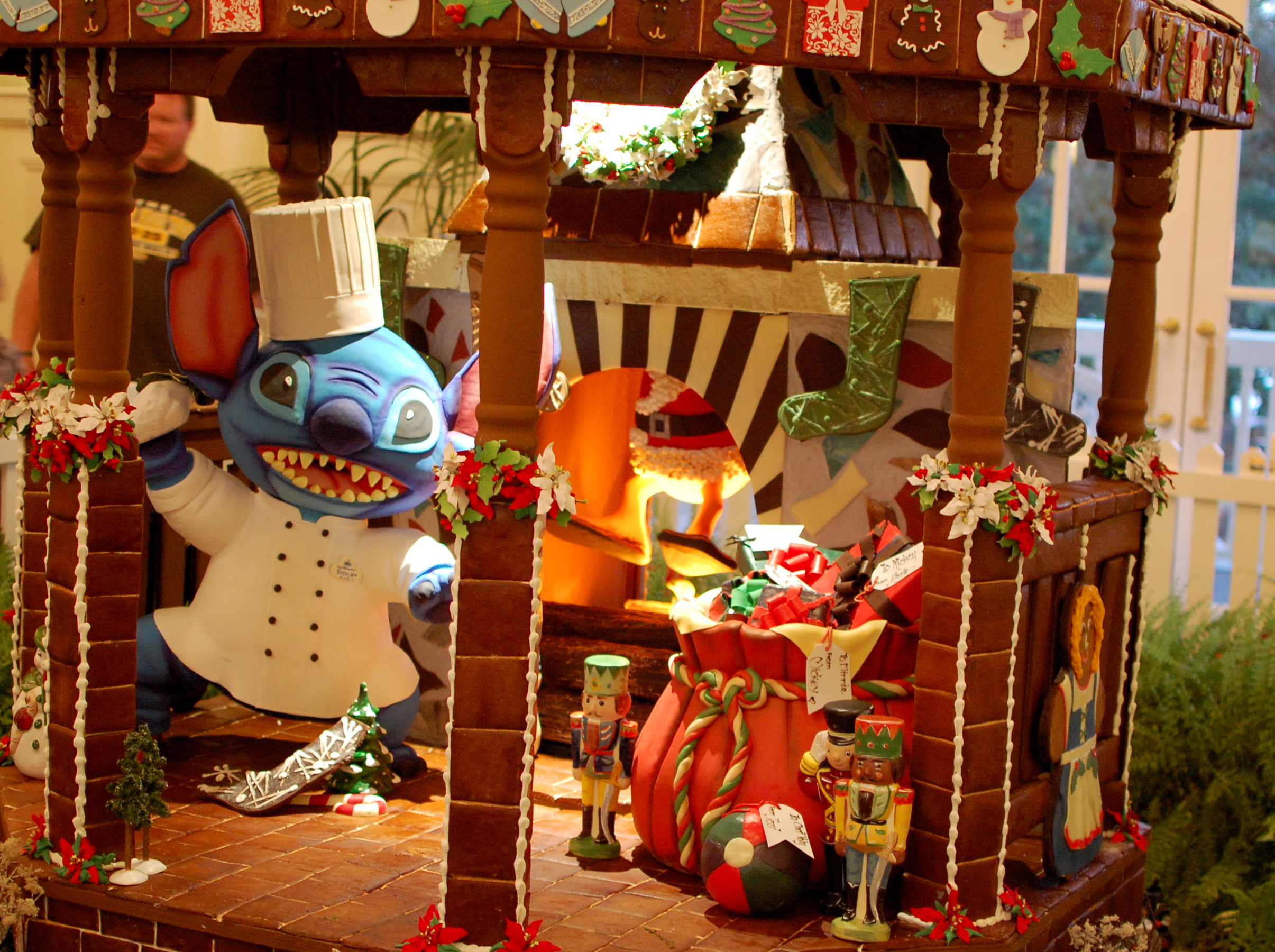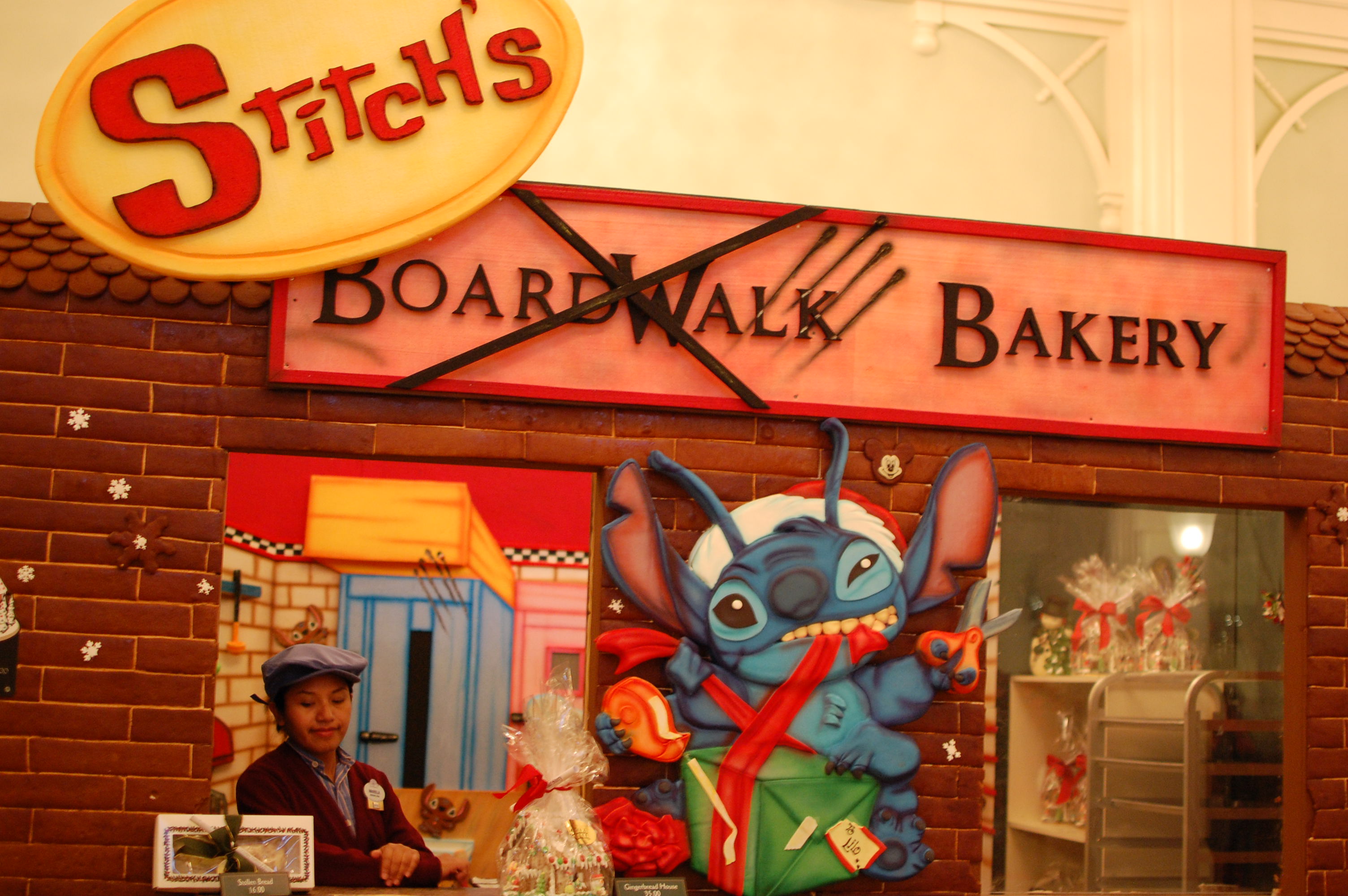 Stuffed, we browsed the kitchen store (disappointing, very little kitchen stuff and not much variety. Stuff also looked – dare I say – cheap.) and the Christmas store (SO MANY PEOPLE BLERGH), and ended our DTD excursion with a quick look in the Art of Disney store. I was thrilled to find some Mary Blair-inspired artwork, some of which we would purchase later in the trip.  The crowds on this Saturday afternoon were just too much for us, so we headed back to the Malibu and navigated our way to the BoardWalk to continue our Christmas decoration circle tour.  The line to get through security at the BoardWalk parking lot extended out into the street, so we knew it was going to be busy. They had also changed the parking lots since our May visit, so it took us awhile to find a spot, but we perservered. The BoardWalk looks fantastic at Christmas; the lobby decor was beautiful, and as a Stitch lover I was pretty taken with Stitch’s bakery.