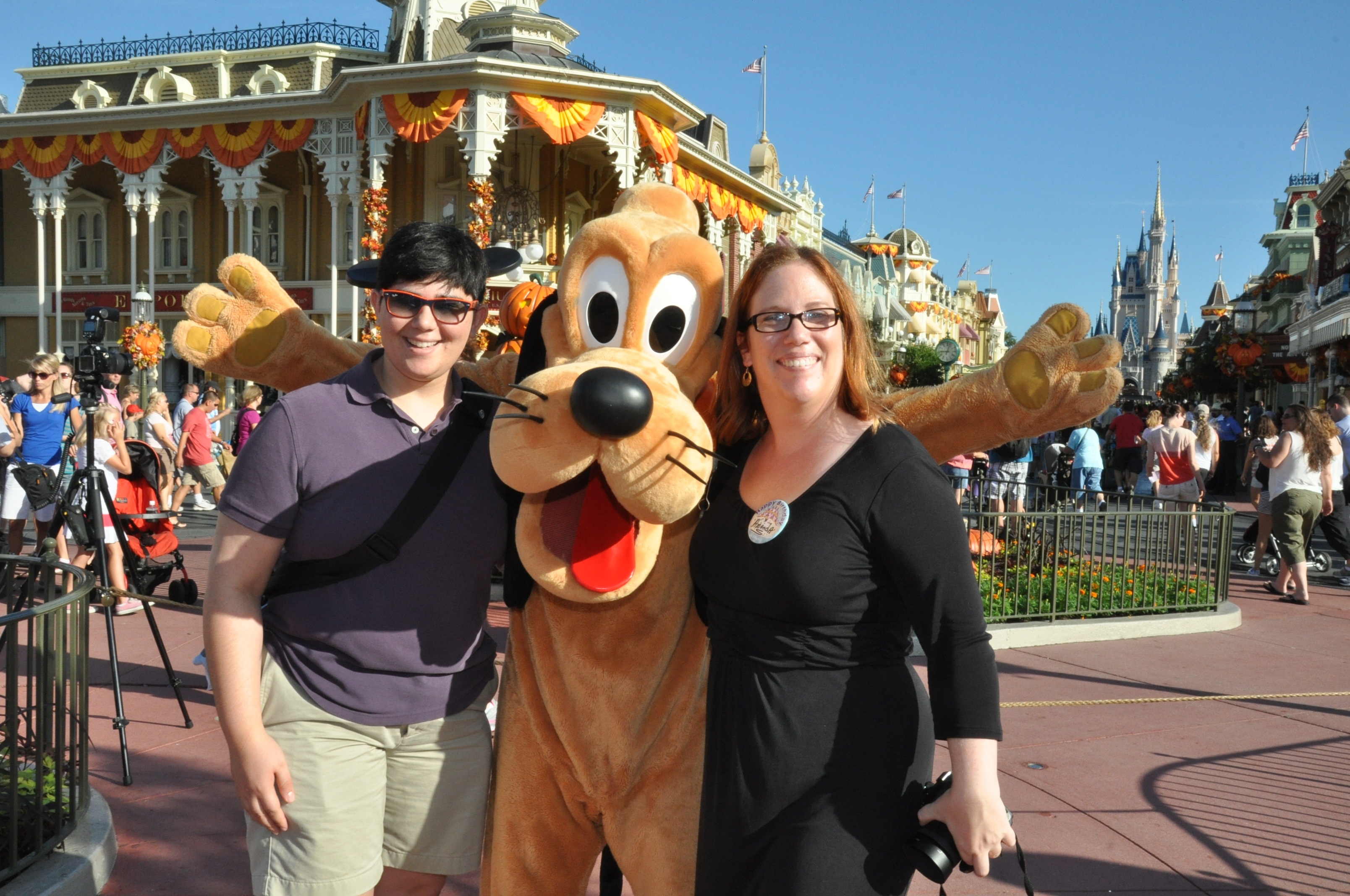 We hop in line to be first to meet Pluto, and have more Photopass pictures taken while we wait. Suddenly, the rope drop crowds stream in, a fun experience to watch from the perspective of *not* being one of the many trying to get in as quickly as possible. We have a great Photopass photographer to meet Pluto: