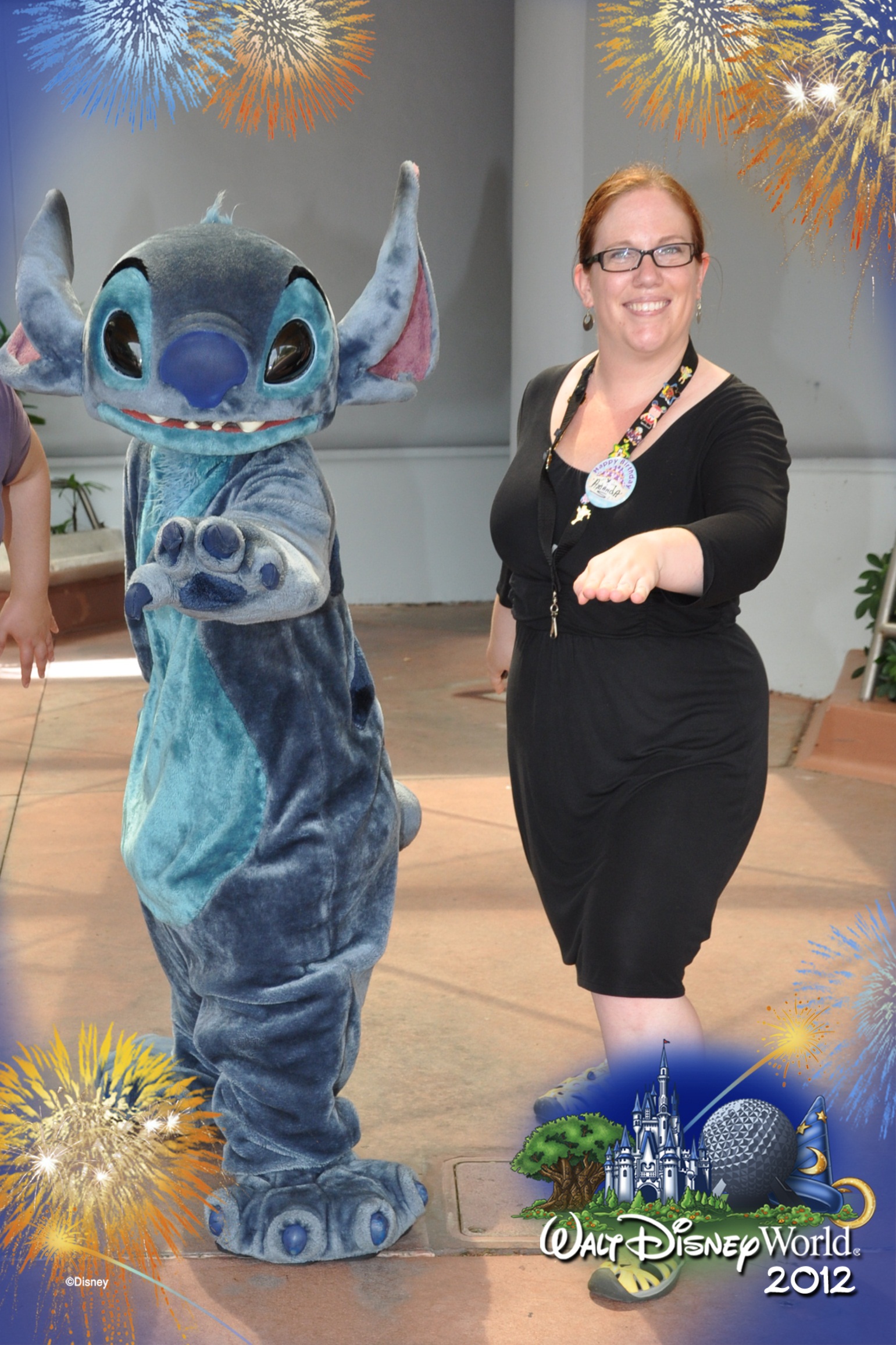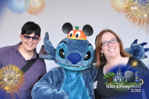 We then walk through the Castle to ride Peter Pan while it’s still a walkon. Here, happy Japanese tourists wave at me in line – it is, I think, the the second time I’ve been mistaken for a cast member in two days. We walk leisurely through Fantasyland, taking pictures of the new construction, and then through Tomorrowland to see the Carousel of Progress, a first for us. With visions of progress dancing in our heads it is off to the Peoplemover, from which we spot Stitch. Emboldened by our Crystal Palace experience, we wonder: do we meet him? I’m hesitant, but we decide to anyway. He’s AWESOME, very friendly, interested in CP’s Orange Bird ears, and so we put them on him for pics. The character attendant with Stitch loves our pins, and remarks that she wishes she had the Tinkerbell pin to complete her cupcake collection. We think we don’t have it, but after about 100 yards we realize we do, so we return to gift it to her. She won’t accept, but happily trades us a pin for it.