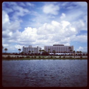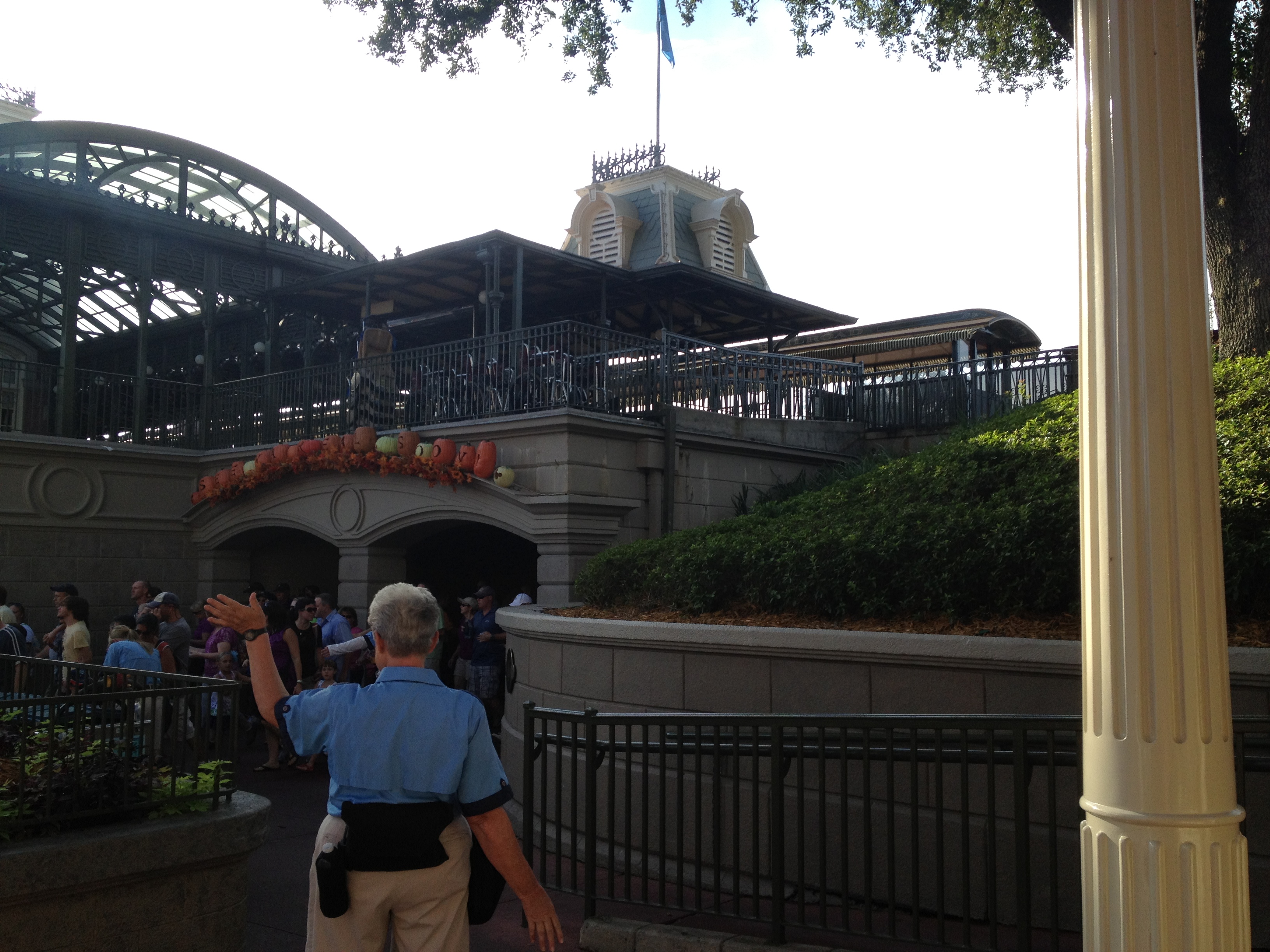 After a good first night’s sleep at the BoardWalk, we got up a little after 7am. We dressed and got ready and had a fairly leisurely breakfast in the lounge; it’s oatmeal, pastry, and fruit for us, plus some chocolate milk and some coffee. Around 8:10 we head to the car and drive to the Magic Kingdom, where we park in the 2nd row and walk easily to the TTC. Since it’s before 8:30am the Express monorail is closed (why?!), so we queue up and miss the first resort monorail since they send it away nearly half empty. A second monorail comes soon enough, but we board and wait, wait, and wait some more. We take off, stop at the Poly, and wait again. Now I’m getting nervous – and kind of grumpy – as we’re supposed to check in for our Keys to the Kingdom tour in six minutes. I’m sweating a bit, and not just because it’s another unseasonably humid day.