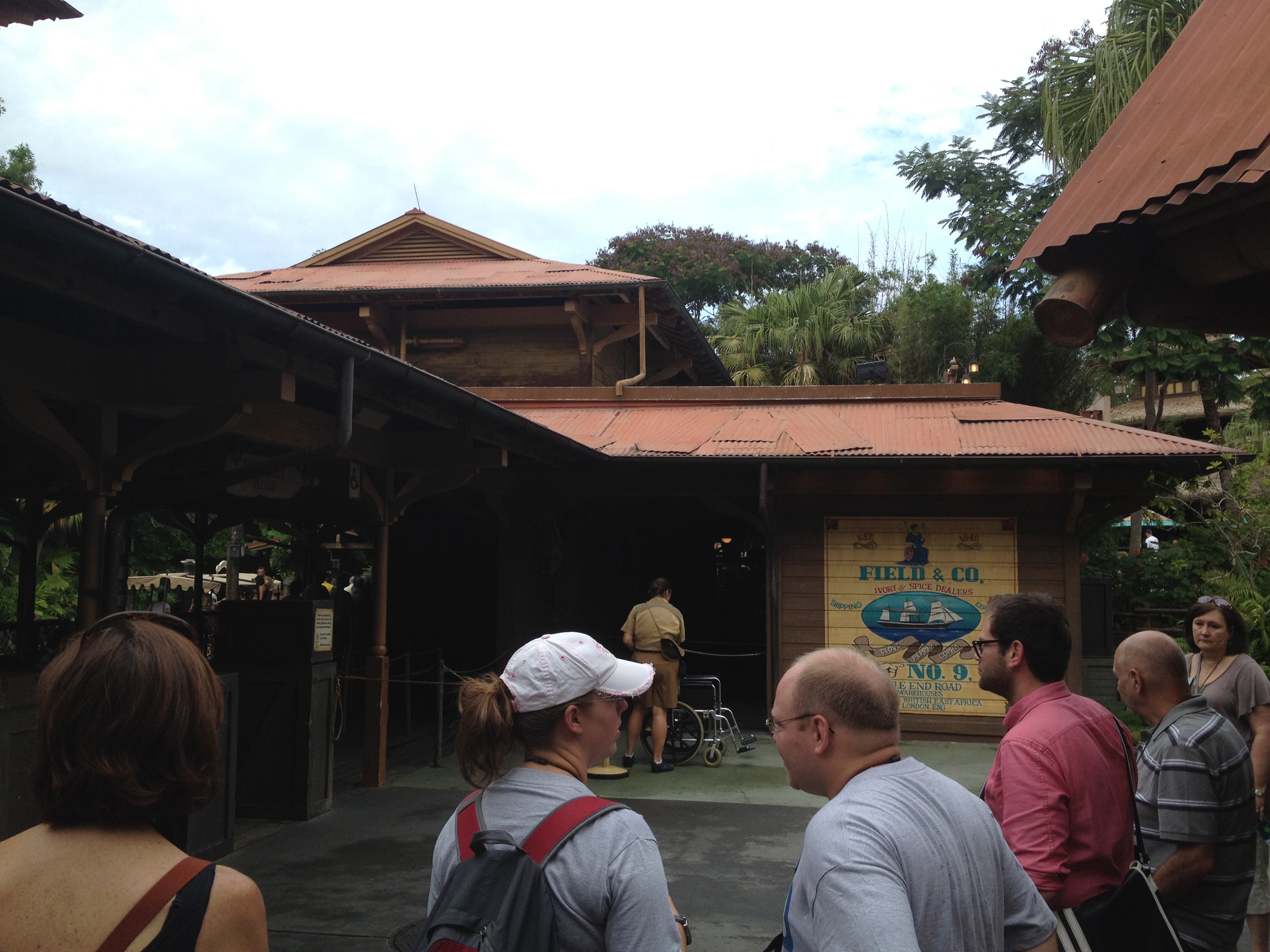 In any case, we depart Center Street to look at a few windows on Main Street, and then we make the trek to Adventureland to stop at the Tiki Room. Here, Kate tells us about the building’s design, and how its function as a lightning rod embodies the principles of the four keys. We then ride Jungle Cruise as a group, with Kate narrating. This part of the tour is actually pretty entertaining, and in spite of my own knowledge of the park, I learn a few new things – the water is dyed! One of the natives loves disco!
