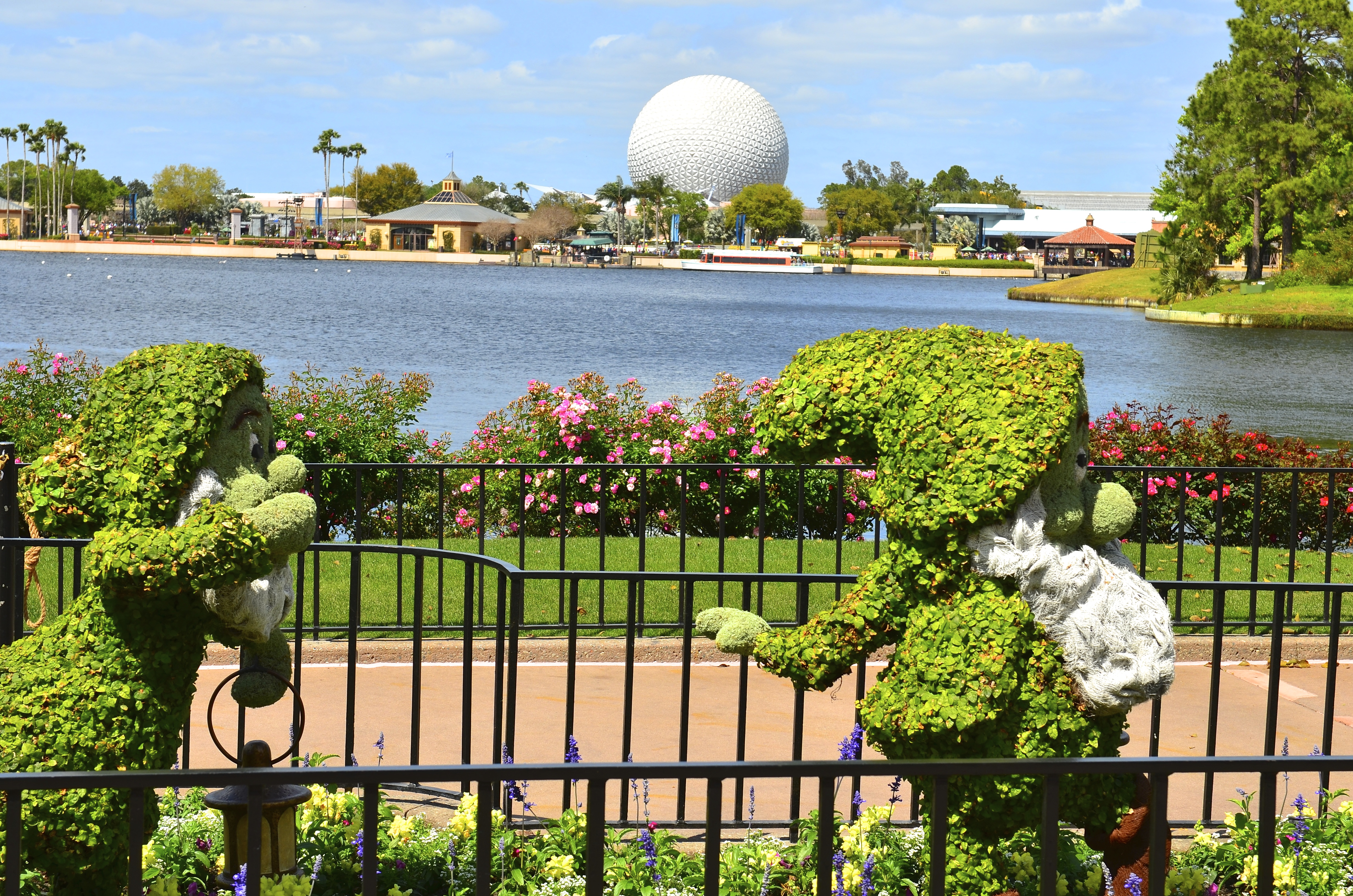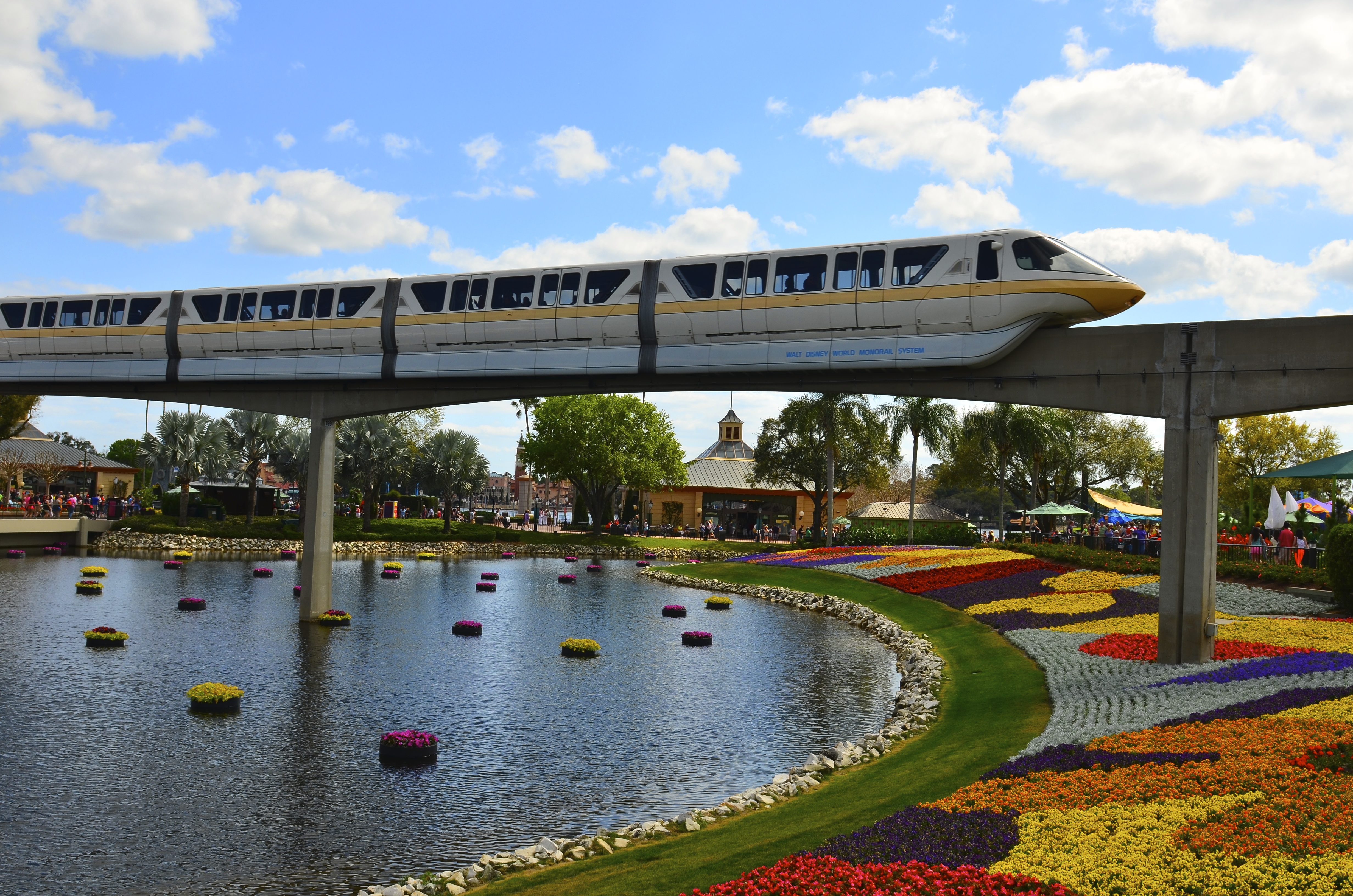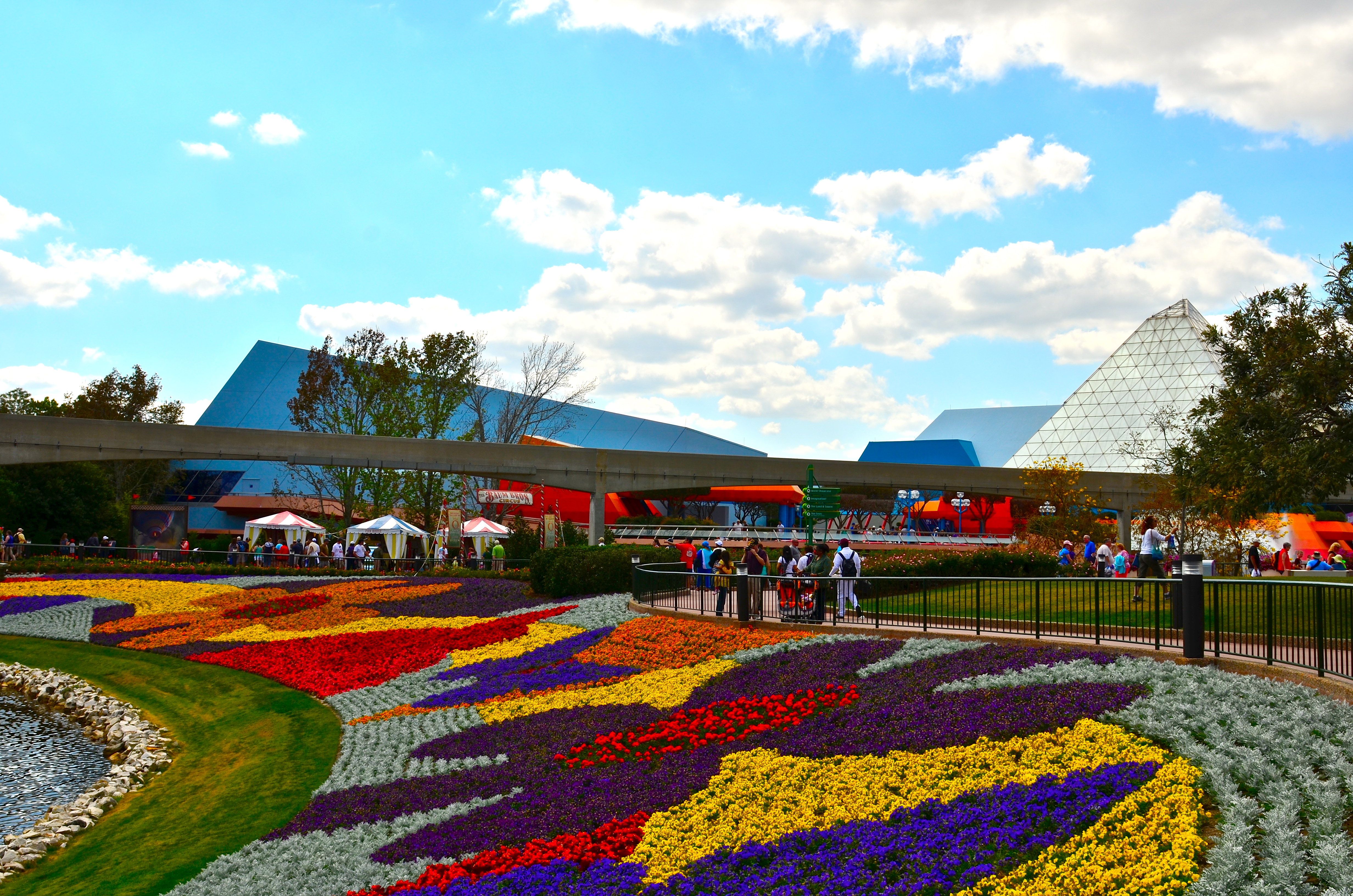 Why yes, we were off to Epcot! Since we had atypically taken the bus that morning (it’s coming back to me – cereal and fruit and iced coffee from the Rix Cafe, bus from the main bus stop – I’VE STILL GOT IT!), we hopped on the Express monorail and were pleased to find an Epcot monorail waiting for us. I love the monorail trip to Epcot, especially the end where you circumnavigate the park from above. My love/hate relationship with Epcot is mostly love, and Flower and Garden is probably my favorite time during which to visit Epcot. Here, let me drown you in some photos: