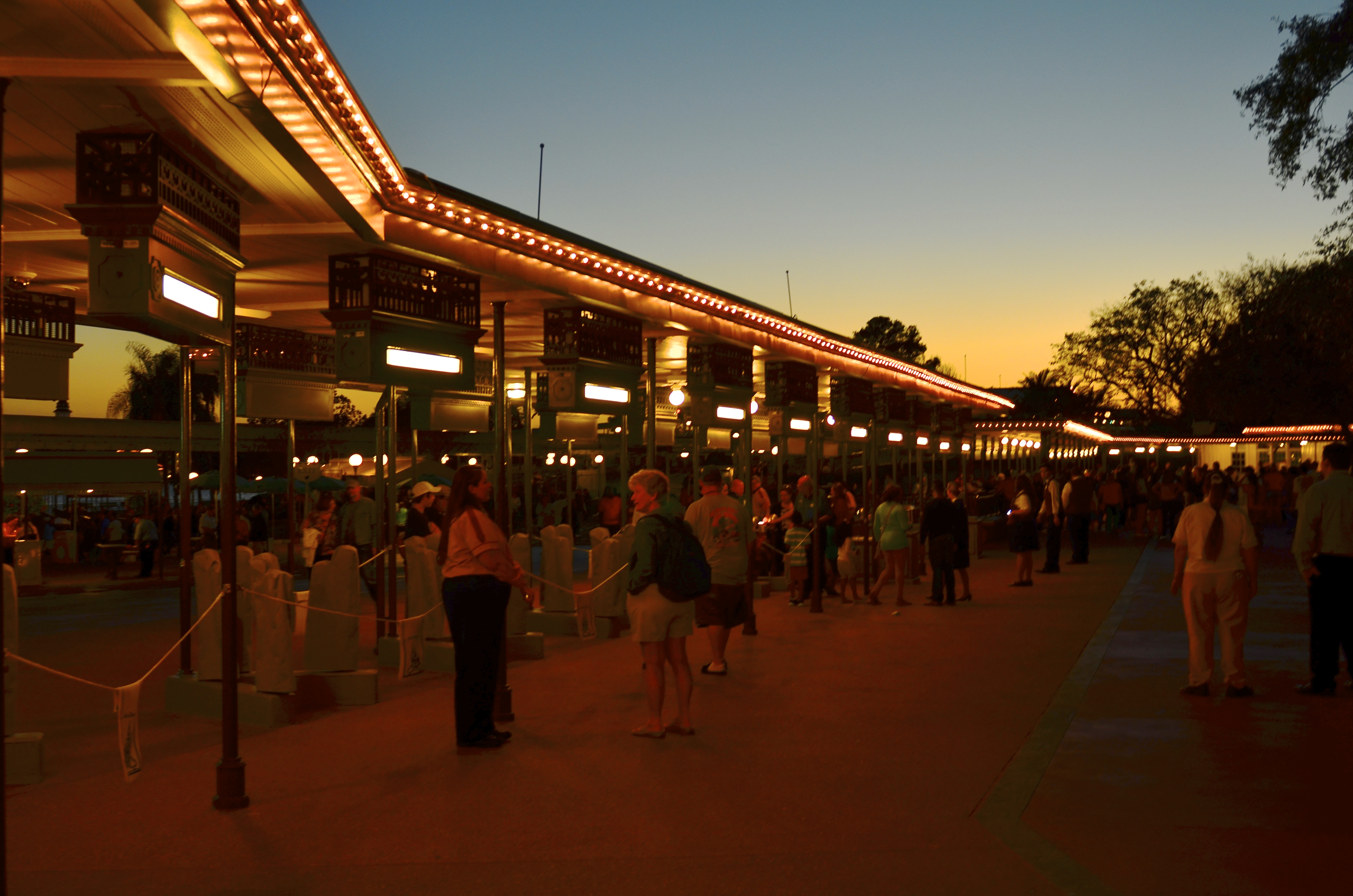 Eventually, the four of us piled into the Jetta and made the short drive back to the TTC parking lot. It was a crowded evening at the Magic Kingdom, but my grandparents hadn’t seen New Fantasyland, and we thought we’d all walk off our dinners at the MK. My grandparents had to first stop at Guest Relations to buy their annual passes (no luck at the Poly), so we waited for them and took in the lovely evening light.