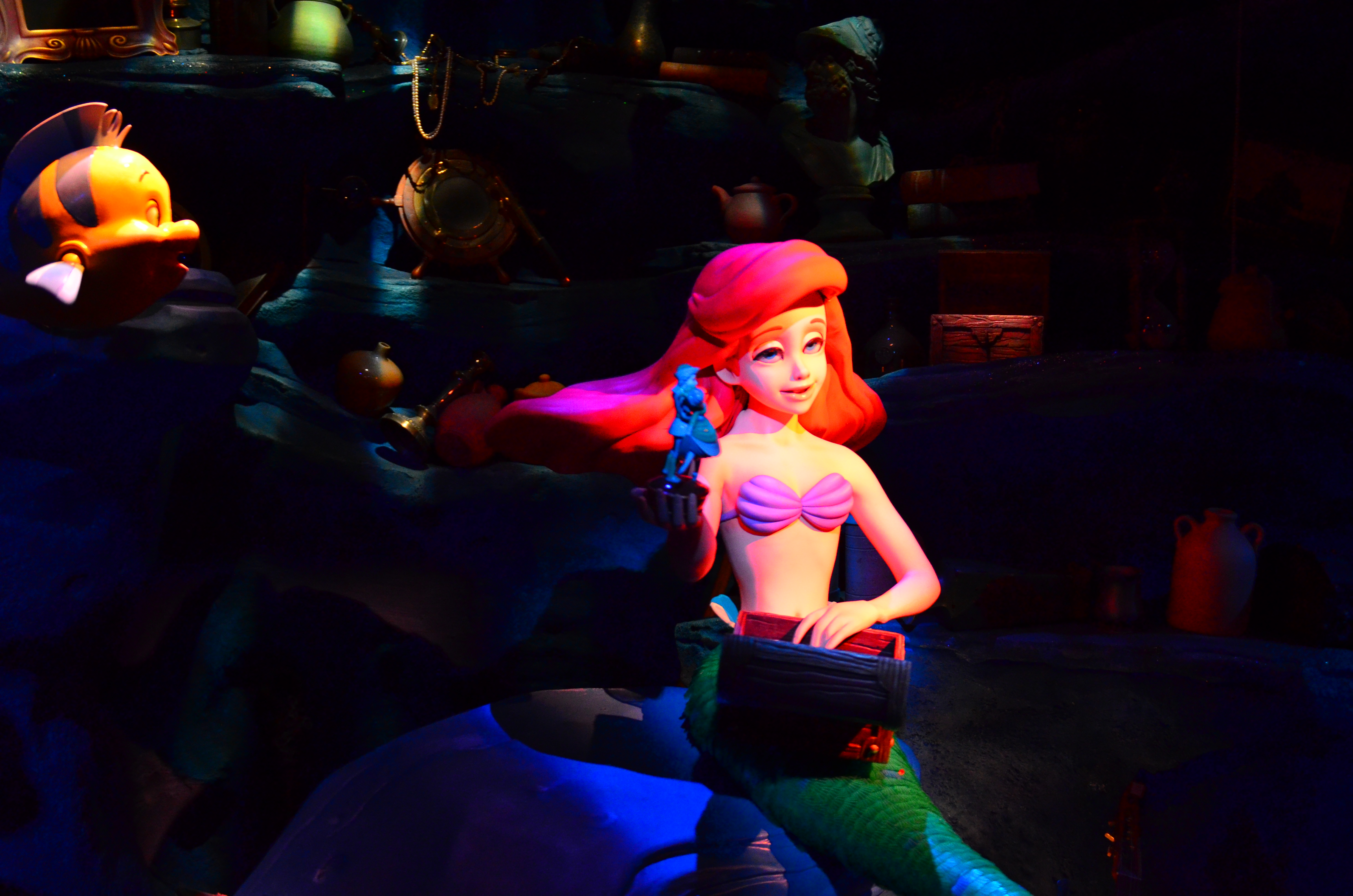 The line for the Little Mermaid ride was something like a ridiculous 80 minutes, but there wasn’t a soul in the queue. I dragged all of us on, figuring that even my ride-averse grandfather would like this one. Indeed, it was a crowd pleaser, or at least not a crowd repeller.