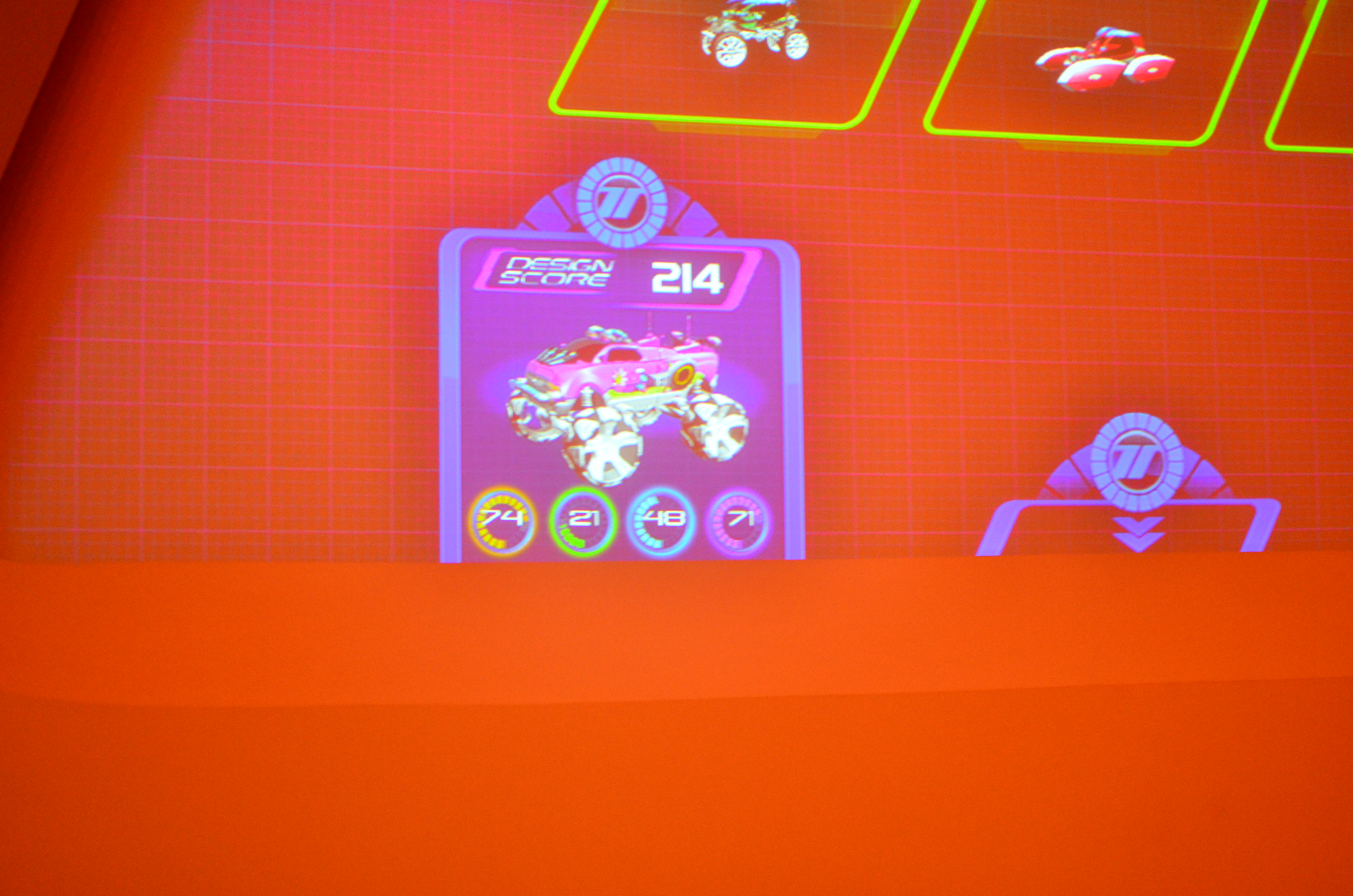By this point it was time to use our first FP+ of the evening, so we wandered over to Test Track. Truthfully we probably wouldn’t have ridden it without the FP+, but I was glad we had it – the standby queue was well out the building by the time we arrived. Sadly, however, FP+ offered us something of a limited advantage, because they’ve changed the queue traffic such that FP users now have to line up to enter the design studio; then design their cars; then rejoin the queue and wait to board. It was a lengthy process, but I have to admit – we had some tipsy fun designing perhaps the most ridiculous vehicle EVER: