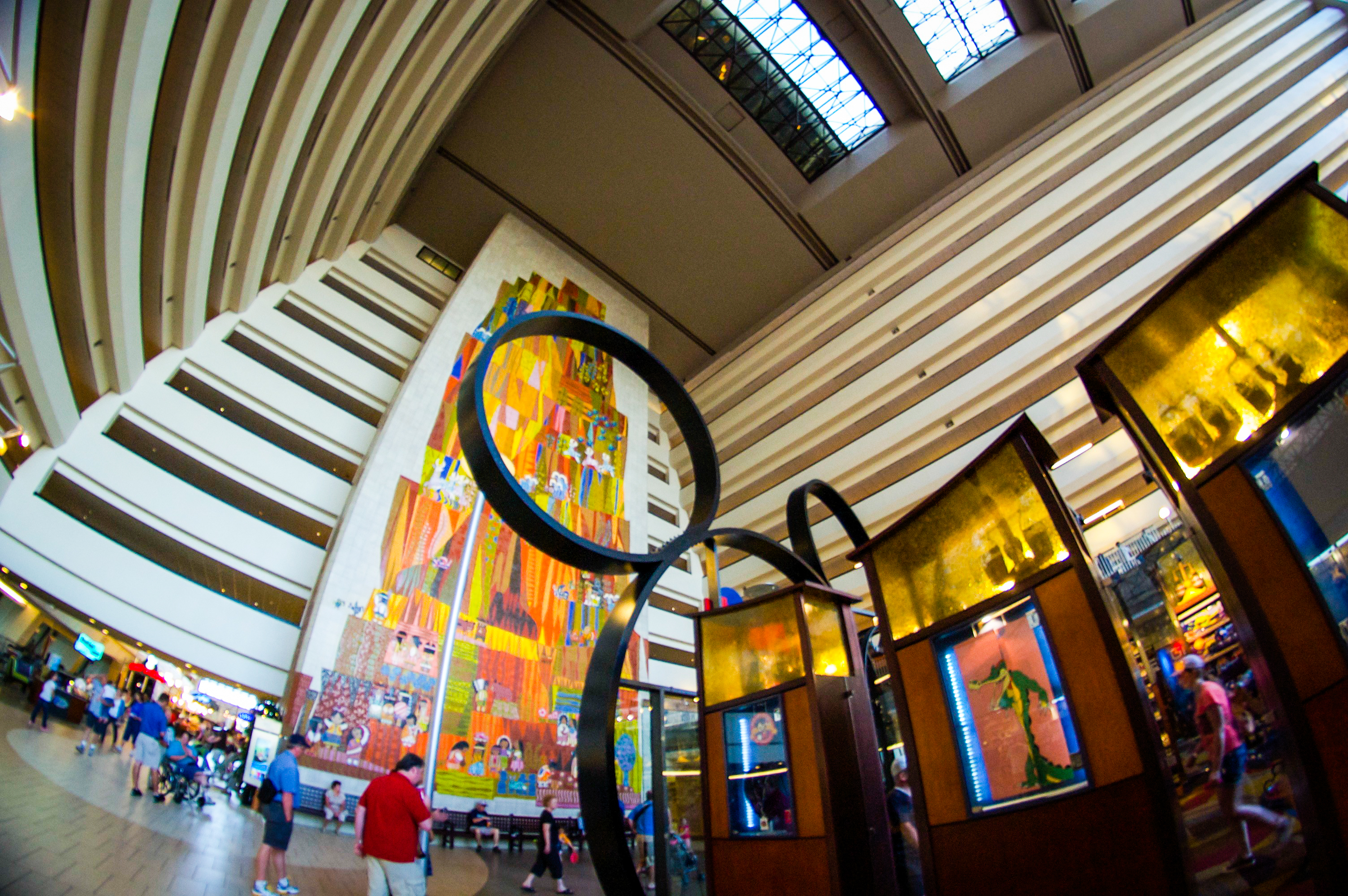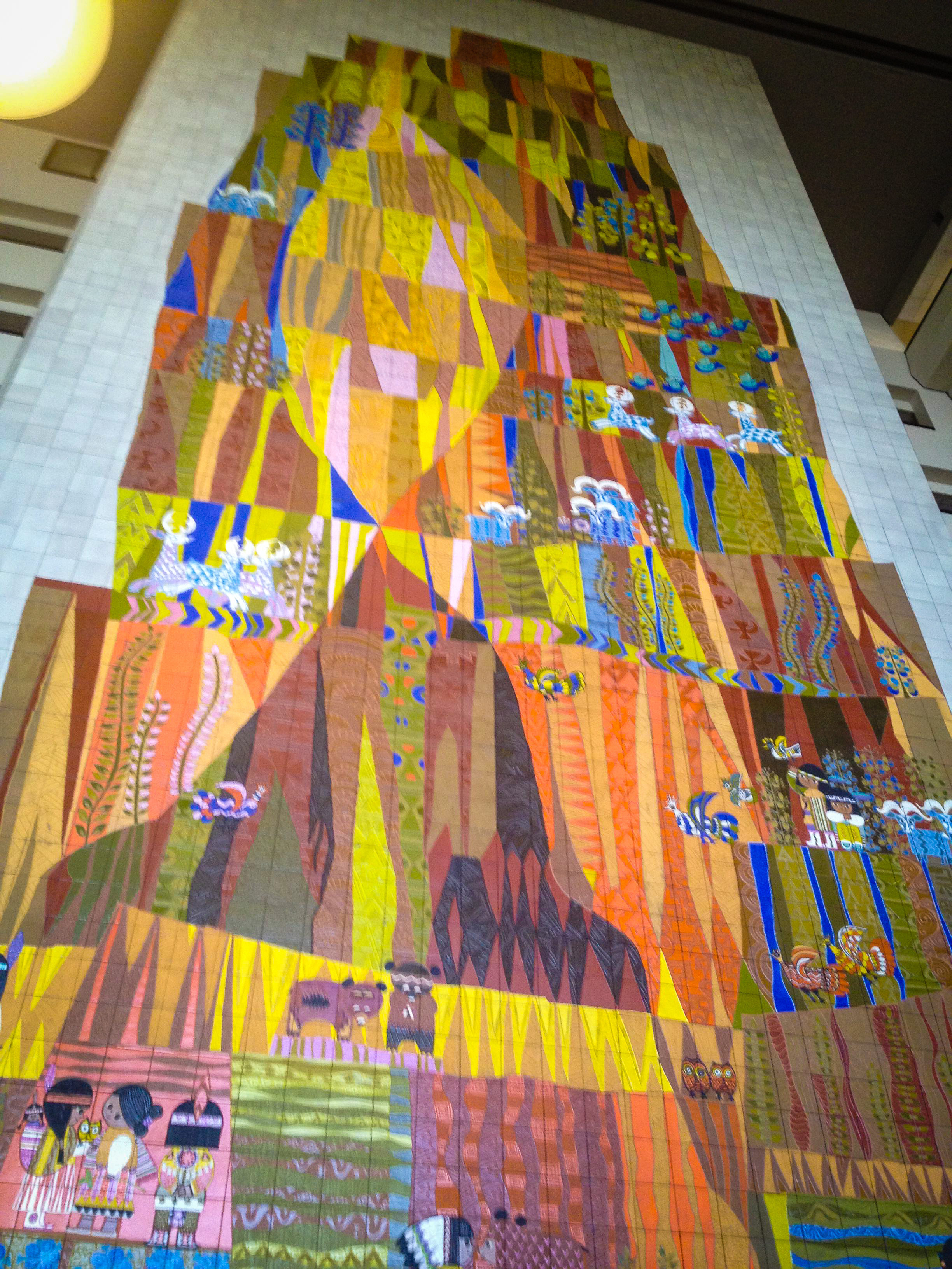 When the Contemporary first opened in 1971, Blair’s mural felt perfectly at home in a resort whose roots were firmly in modern/mid-century modern design. The Contemporary’s architect was a man named Welton Becket, a close friend of Walt Disney and the man responsible for the distinctive Los Angeles style of architecture that sprang up in the 1950s and 60s. Inside and out, the Contemporary represented the best of the mid-century modern ethos: simple, clean lines; use of materials like glass, ceramic, and steel; and an informal, organic interior that was flexible and comfortable.